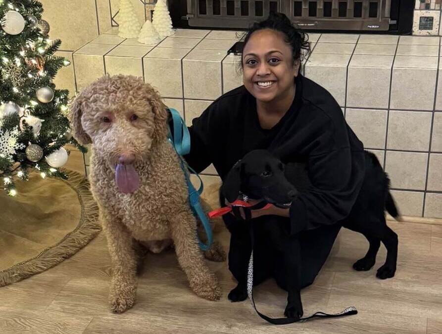 6 month old Chai is a bouncy girl. She is the only one of the pups that likes the toys in the yard. She was happy to play with another dog and to run free without her cone on. When she was done playing she came in for lots of snuggles. Chai is the result of a litter between a AKC lab and Goldendoodle.