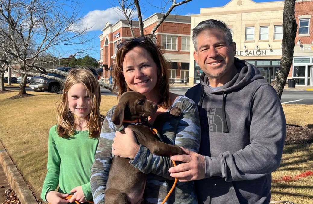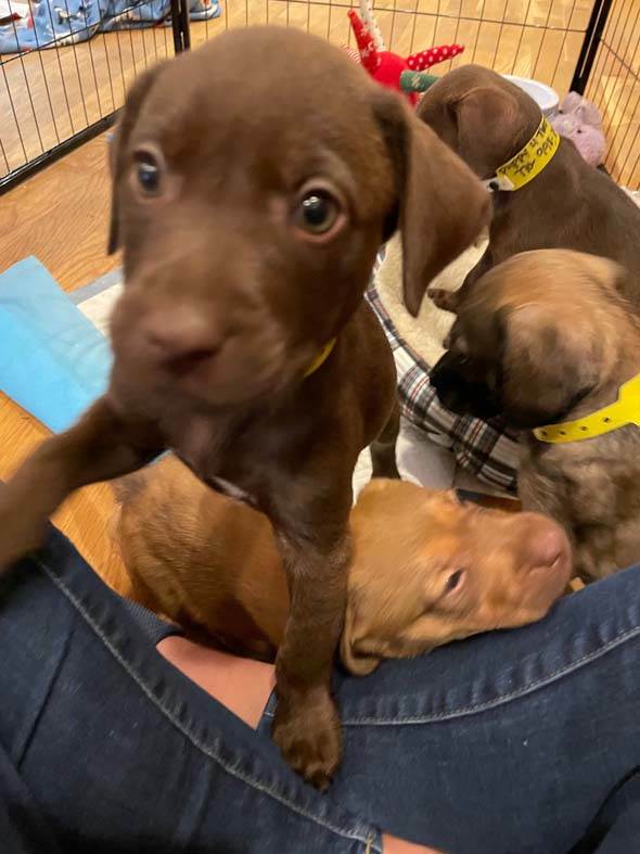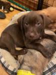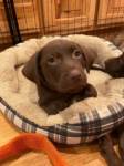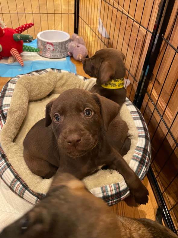 I am chocolate brown with beautiful eyes and a patch of white on my chest. My foster mom calls me a little angel but I can be a bit mischievous. I shocked her when I climbed out of my puppy play pen and joined her for a zoom meeting. I love playing outside with my siblings and will do well with a family that had another dog. I’m also doing well with house training. I’m excited to meet my forever family.