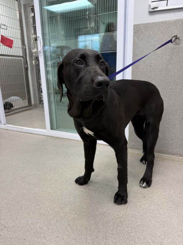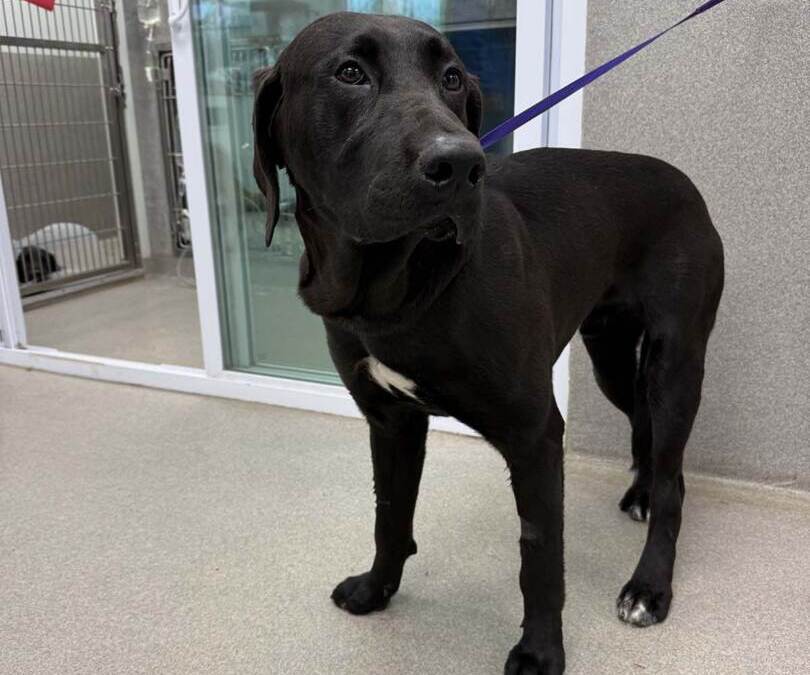 Maddox is a 1-year-old Black Lab + Styrian Coarse-Haired Hound mix looking for a patient, loving home to help him grow in confidence. He’s dog-friendly (he did great around my dogs this morning!) and has a very sweet nature, though he can be timid when first meeting new people.