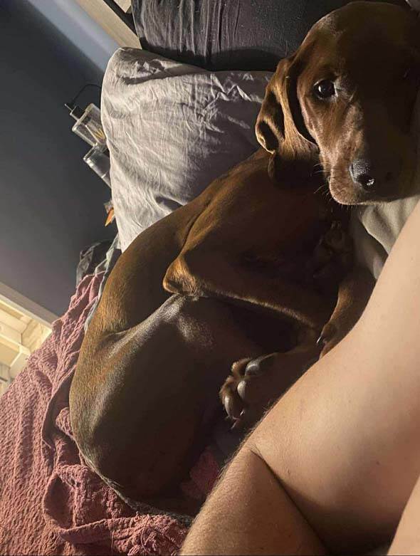 Red is extremely affectionate and just wants his person. He’s a big cuddle bug at bedtime, loves being under a blanket, and is happiest chewing a bone nearby. Like many hounds, he can be vocal when left alone, but it comes from his deep attachment and desire for companionship. Red would thrive in a loving, patient home where he can feel safe, included, and cozy.